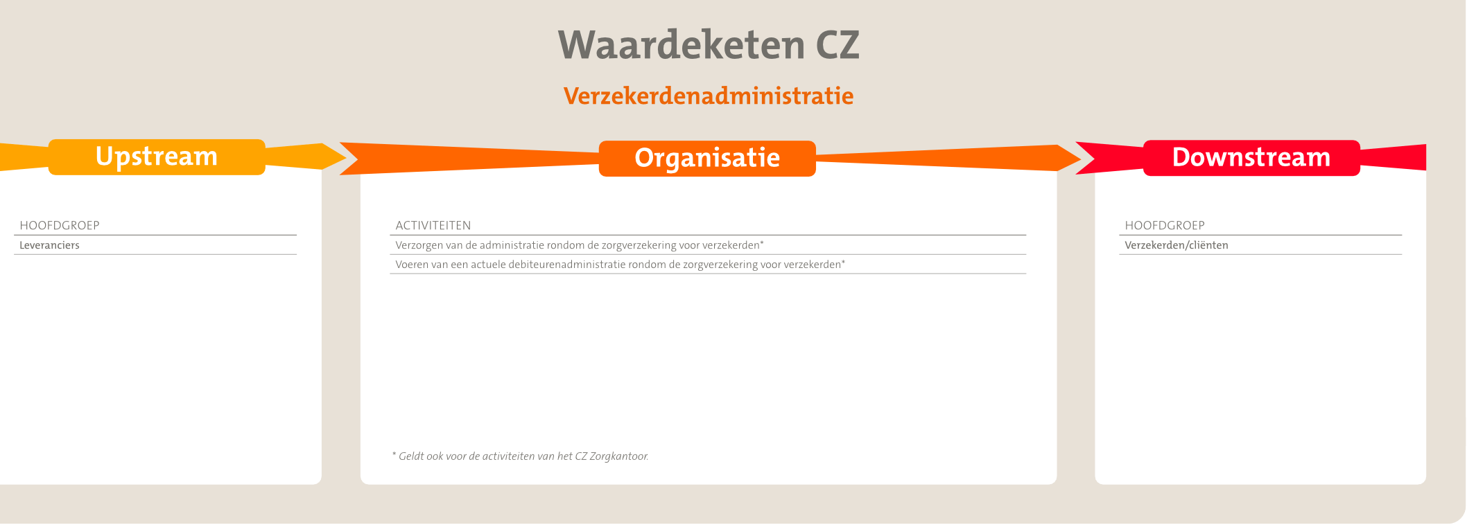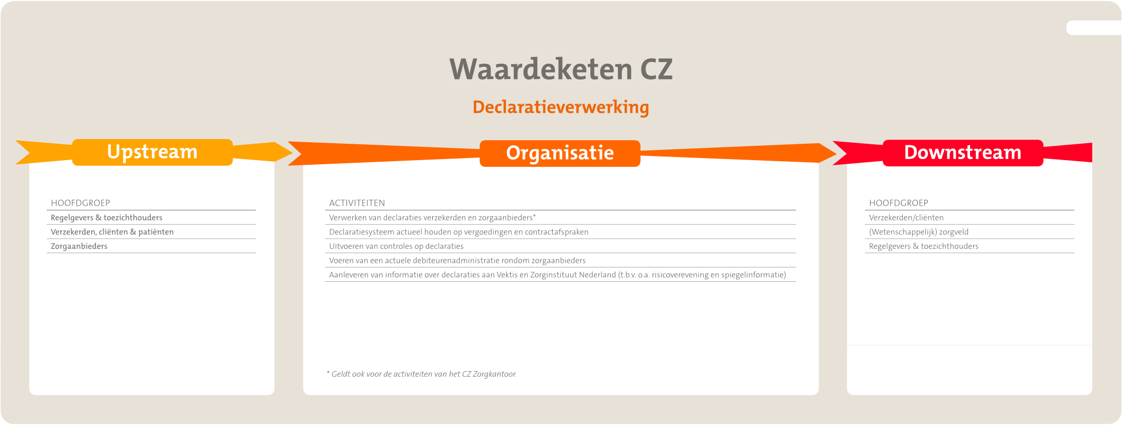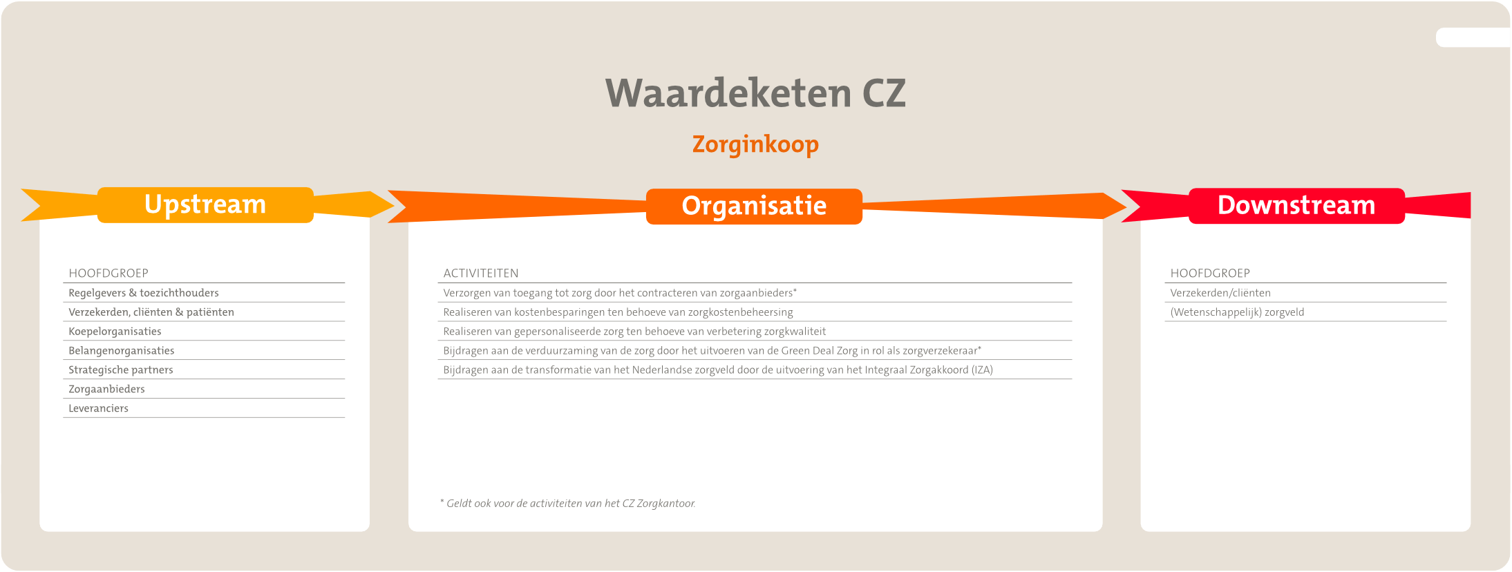 In 2023 hebben wij op een zorgvuldige manier, met inbreng van alle divisies en afdelingen binnen CZ groep, de waardeketen van onze organisatie in kaart gebracht. Het vertrekpunt was de generieke waardeketen die we in 2022 in brancheverband binnen Zorgverzekeraars Nederland hebben opgesteld. De aanpassing en completering van deze waardeketen voor CZ groep geeft inzicht in onze belangrijkste bedrijfsprocessen en ‘upstream’- en ‘downstream’-ketenpartners.