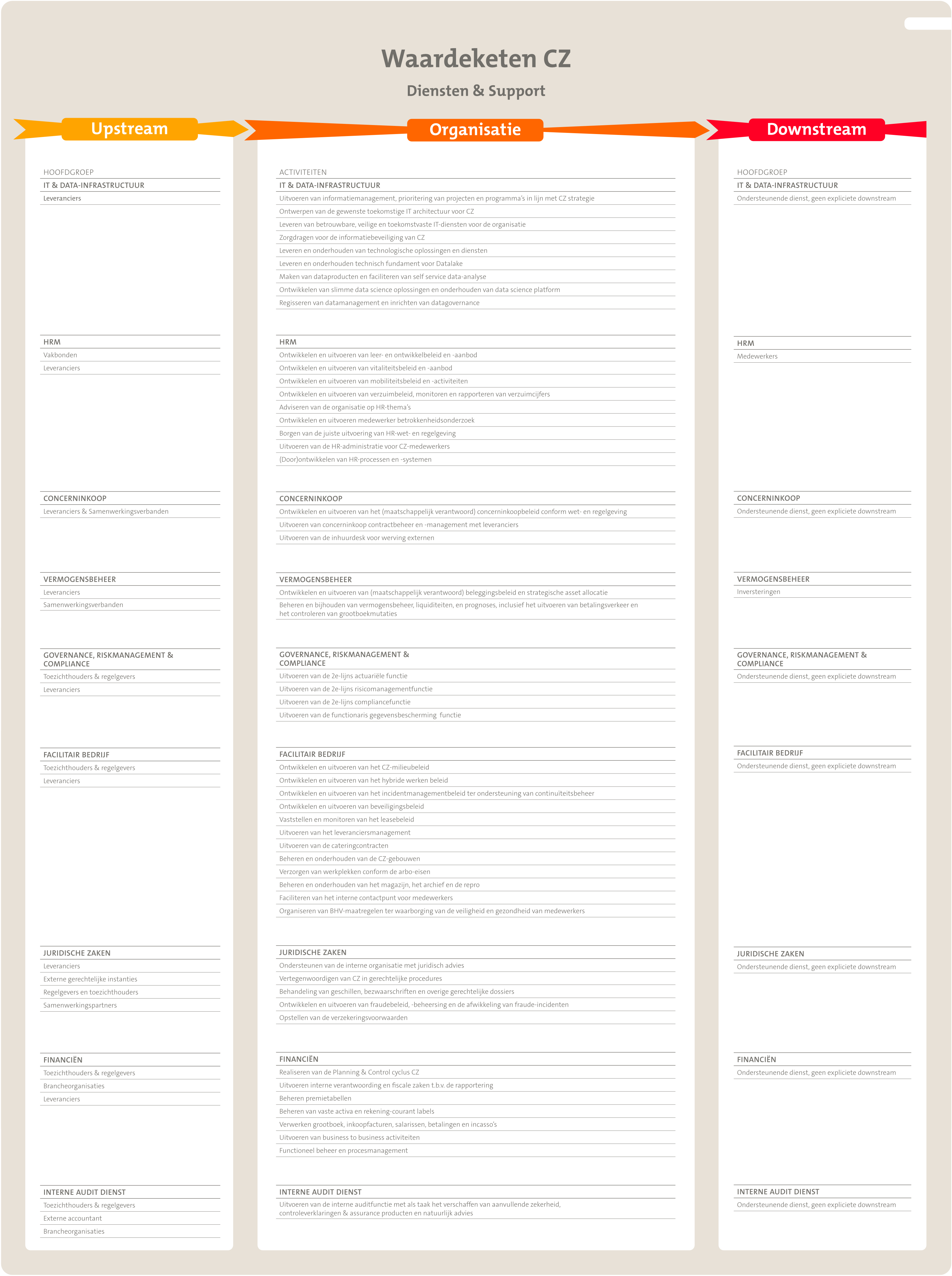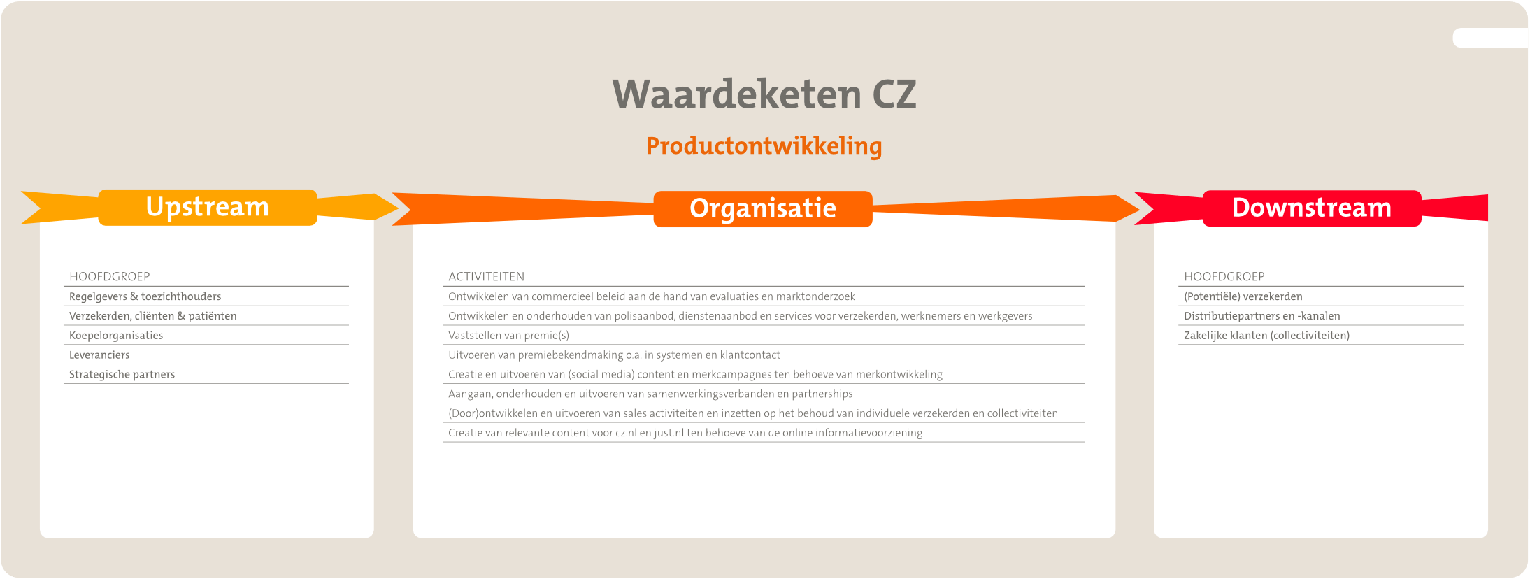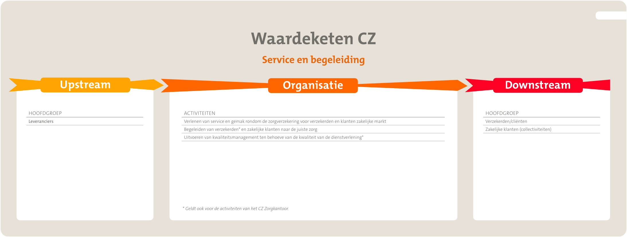 In 2023 hebben wij op een zorgvuldige manier, met inbreng van alle divisies en afdelingen binnen CZ groep, de waardeketen van onze organisatie in kaart gebracht. Het vertrekpunt was de generieke waardeketen die we in 2022 in brancheverband binnen Zorgverzekeraars Nederland hebben opgesteld. De aanpassing en completering van deze waardeketen voor CZ groep geeft inzicht in onze belangrijkste bedrijfsprocessen en ‘upstream’- en ‘downstream’-ketenpartners.
