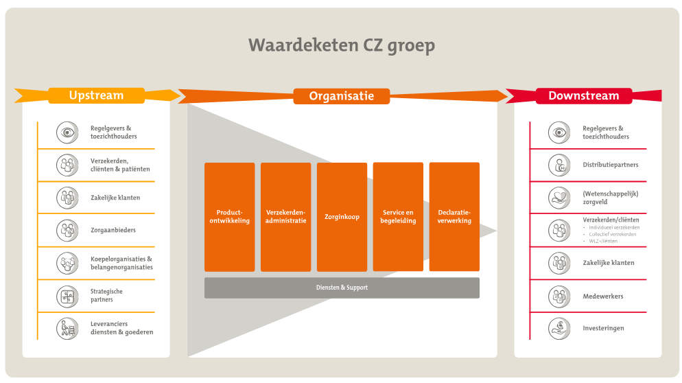 Onze waardeketen bestaat zowel aan de toeleveringskant (upstream) als aan de distributiekant (downstream) voornamelijk uit in Nederland gevestigde verzekerden, zakelijke klanten, partners, leveranciers en andere belanghebbenden. Het beknopte overzicht van de waardeketen van CZ groep is in onderstaande afbeelding weergegeven.